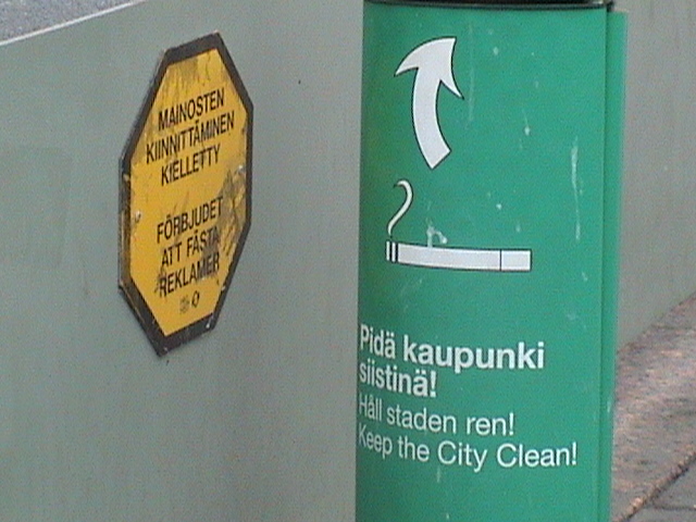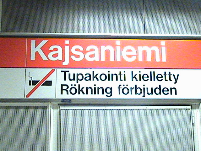 (Tupakointi on muuten kielletty kaikilla yleispaikoilla, jopa pysäkillä ja rautatieaseman laiturilla.)(Кстати курить запрещается во всех общественных местах, даже на остановках и на платформах ж/д вокзала).