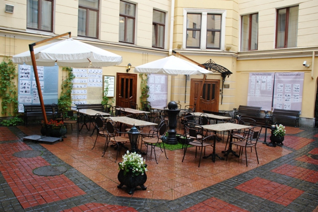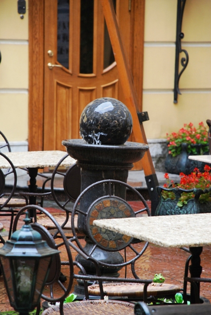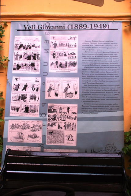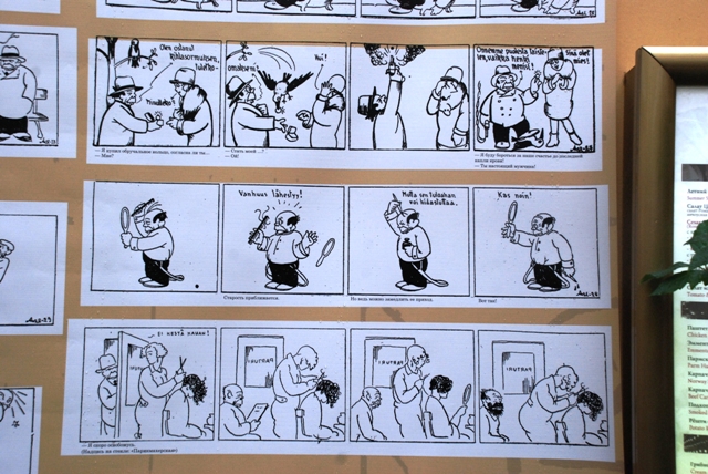 Причине дождя народу, кроме нас, на выставке в уютном внутреннем дворике гостинице "Гельвеция" не оказалось. Так что никто и ничто не помешало нам насладиться созерцанием работ финских карикатуристов!